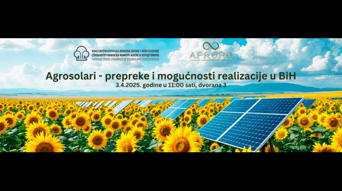 Vanjskotrgovinska/Spoljnotrgovinska komora BiH u suradnji s Agencijom za projektni i poslovni konzalting APROPO, organizira konferenciju „Agrosolari – prepreke i mogućnosti realizacije u BiH“ koja će se održati na Sajmu gospodarstva Mostar, u četvrtak, 10.4.2025. godine u 11:00 sati u dvorani 3.